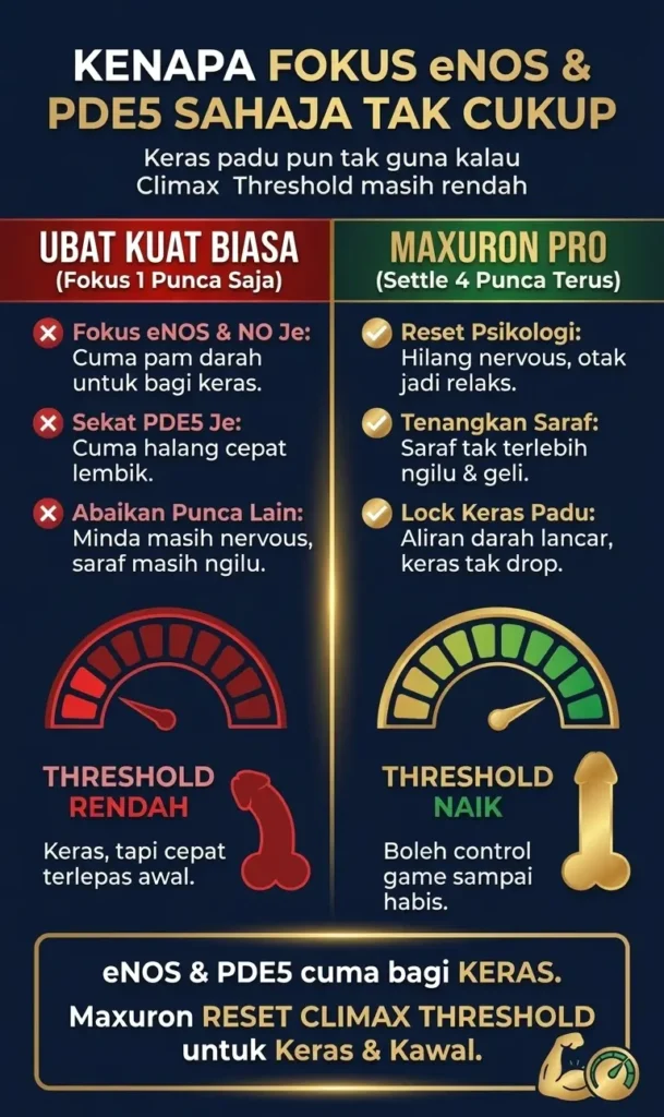 Sebab itu MAXURON sekadar “bagi keras”, tapi bantu dari sudut kawalan, ketahanan dan ereksi yang lebih kuat & solid.